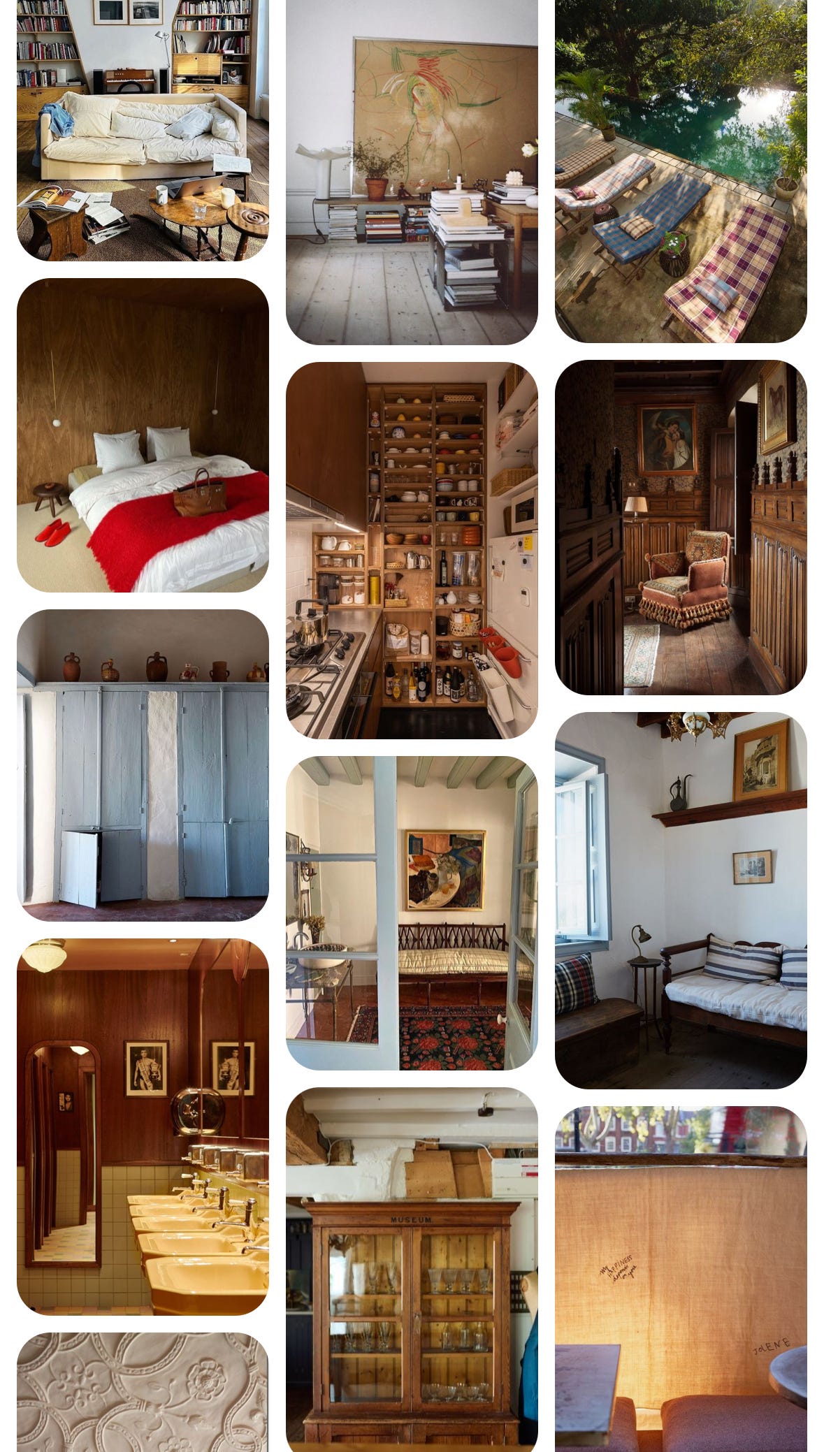 But if I mentally zoom out a bit I can start to see the more adaptable aspects of what’s here. For one, warmth: I love the feeling that having lots of wood in a room brings to a space. Another is a general unfussiness: stacks of books, disheveled pillows, and collections of glassware or ceramics make it feel like someone has lived there for a long time. I clearly like pops of red and baby blue amongst a lot of neutrals. I don’t like a lot of negative space.