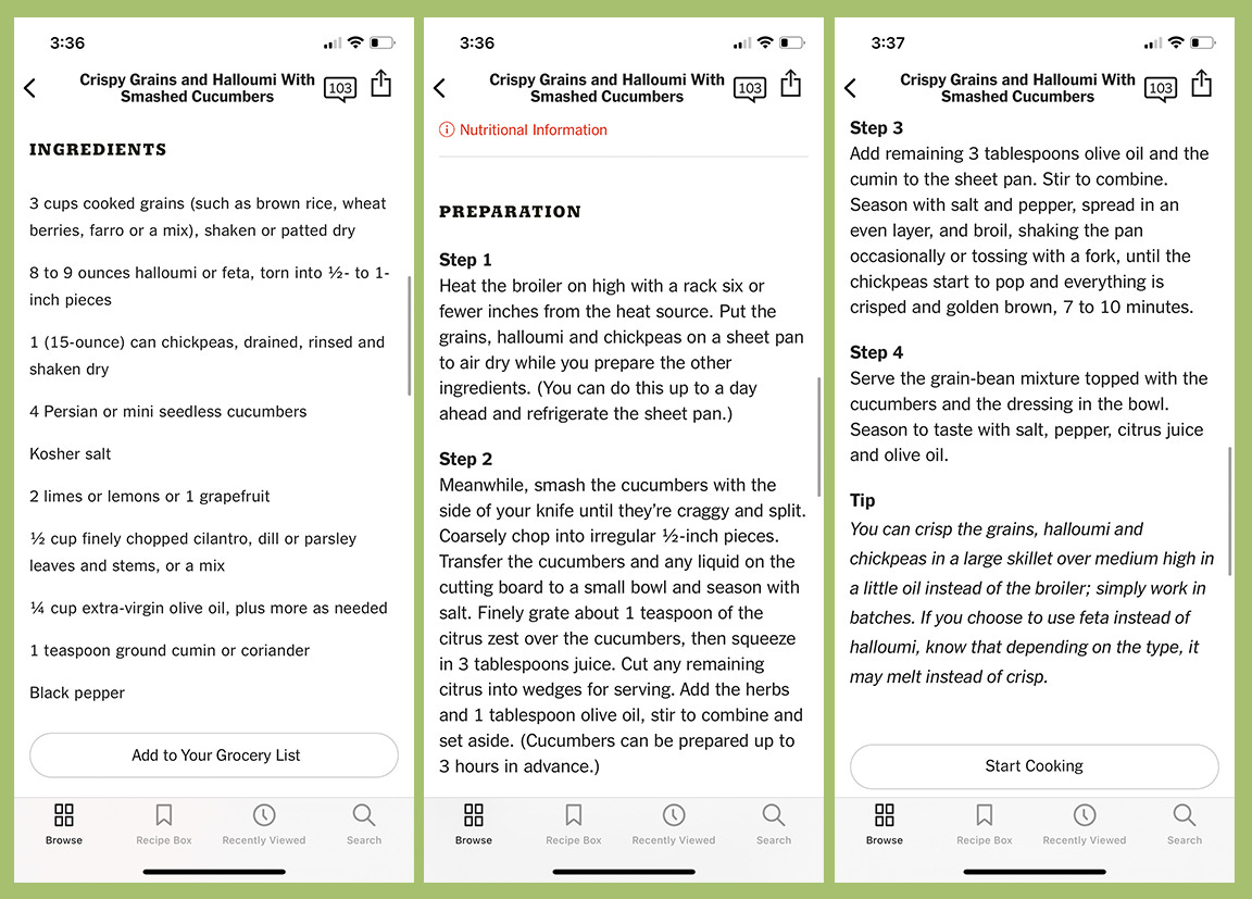 This last Sunday we made Ali Slagle’s crispy grains and halloumi with smashed cucumbers and it was SO GOOD. Very few ingredients were used and very few dishes were dirtied. It has the essence of the famous Sqirl crispy rice salad but does not require the frankly ridiculous number of steps that recipe requires (I have the book and can make almost nothing from it, it’s so unnecessarily complicated.) This recipe is on NY Times Cooking—which I 100% recommend paying for if you cook a lot—but I’ve sneakily screen-shotted it so you can read it below. There’s a bit of a choose-your-own-adventure attitude in this ingredients list, but we went with brown rice, halloumi, lemons, parsley, and cumin.