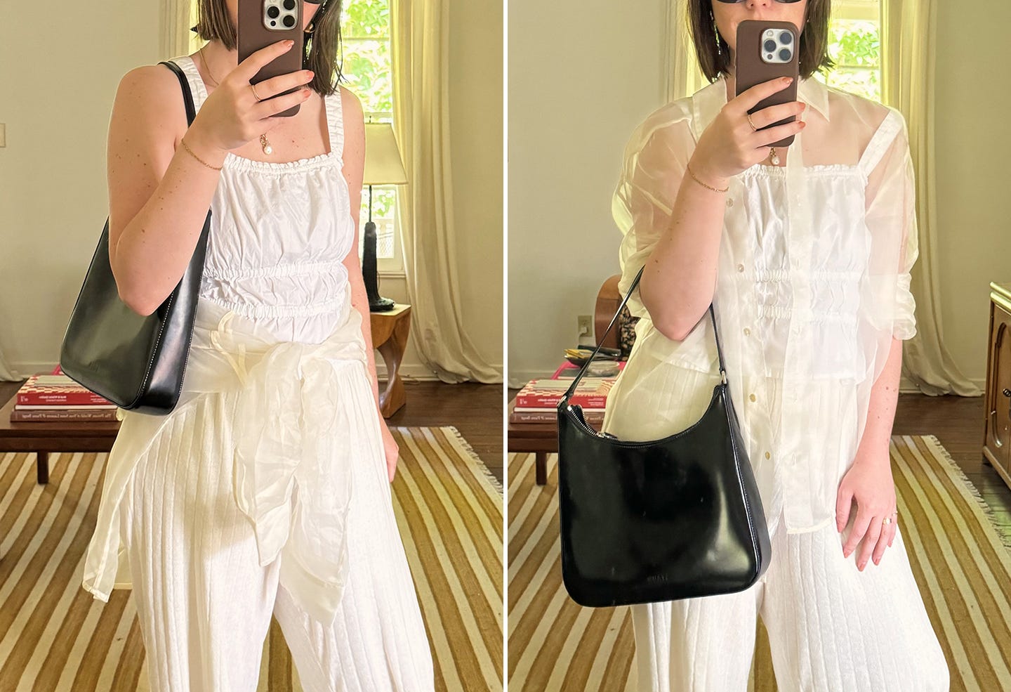 Vacation packing is historically not one of my strengths. I need options—a lot of them—and I always end up bringing one giant wool sweater or an extra bulky jacket that takes up half my suitcase. On my last trip I took a different approach and instead focused on mix-and-match separates that I could pair in near-infinite combinations, including three pairs of Donni pants (two taffeta, one pointelle.) It was a revelation. Thus, these organza pieces will be joining me on any and all jaunts this summer.