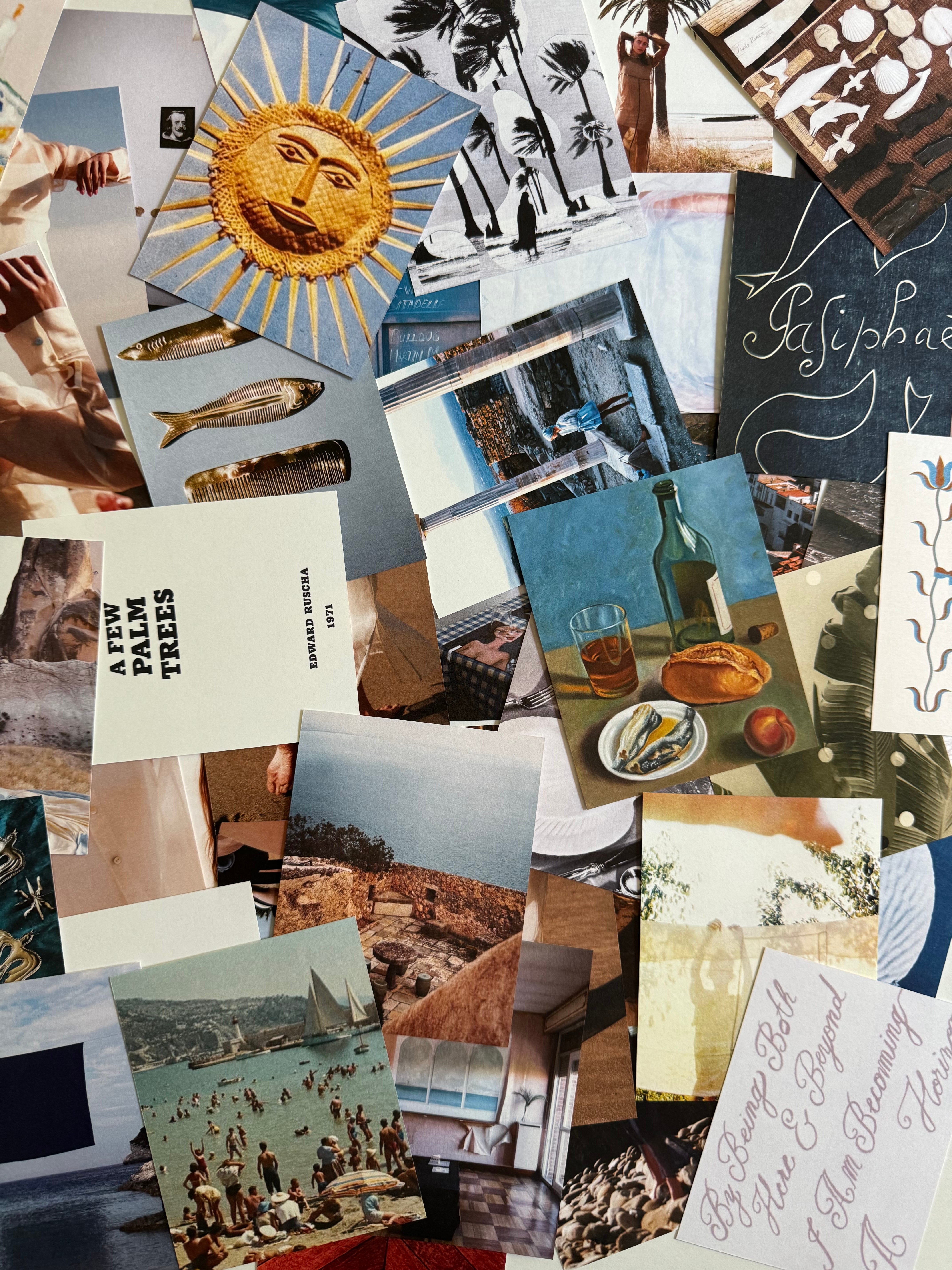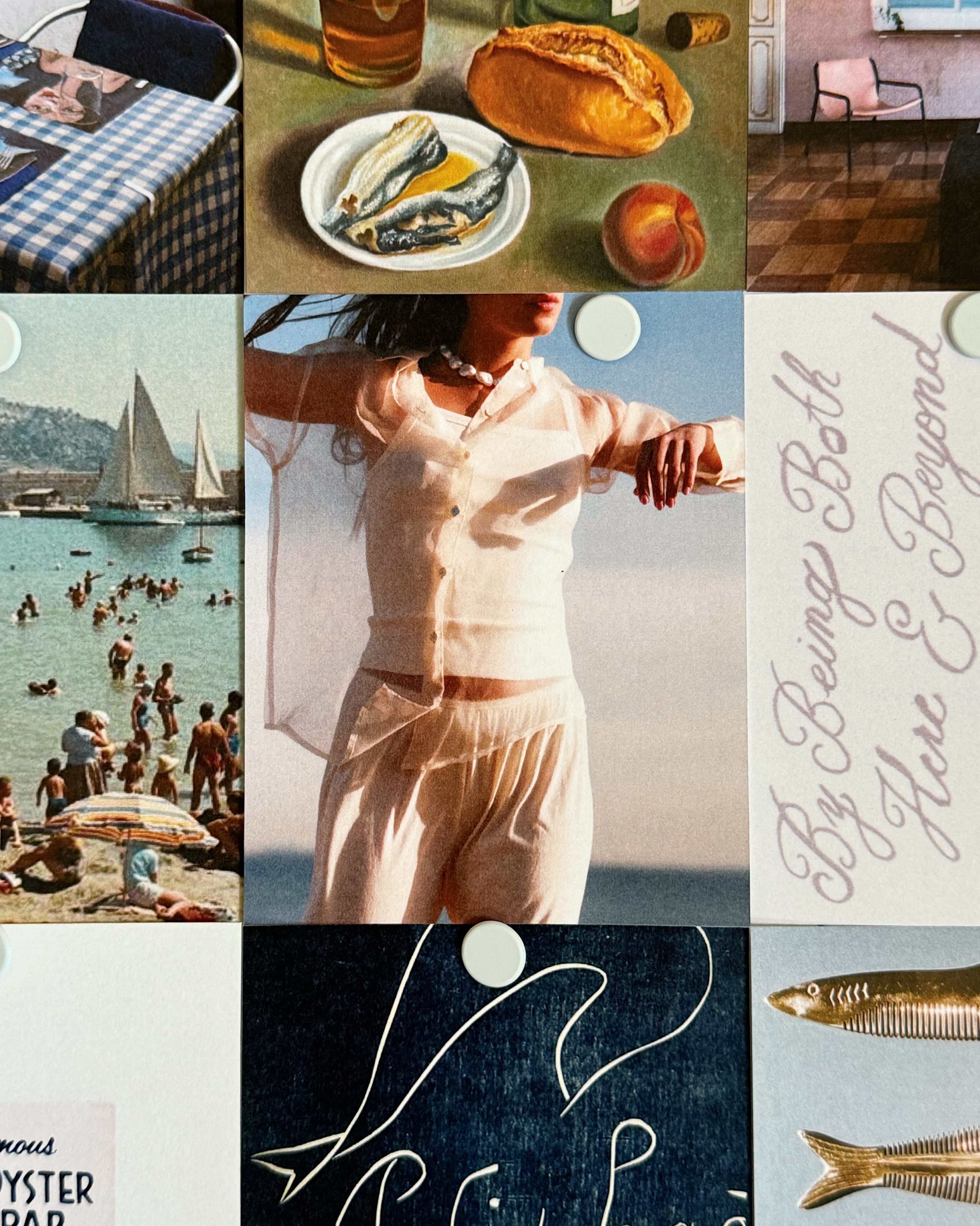 Mood board sources, from left to right: A photo I took in Cadaqués, Spain, 2019; Nature Morte aux Sardines, Angel Planells Cruyanes, c. 1930; Estado Real, Elvira Solana, 2018; Growing, George Greaves, 2021; still from Along the Coast, dir. Agnès Varda, 1958; Donni Organza Shirt in creme; Mark Strand quote, Tessa Forrest, 2024; Jeanloup Sieff and Jean Shrimpton in Mykonos, Richard Avedon, 1966; vintage matchbook from Famous Oyster Bar Restaurant in NYC; Pasiphaé, Henry Matisse, c. 1944; vintage hair combs, source unknown; deflated hot air balloon in Cappadocia, Turkey by Patricia Sofra, 2017; moiré fabric from Dedar Milano, shot by Andrea Ferrari; woven sun sculpture from Joan Miró’s studio in Mallorca, Spain; Donni Organza Long Sleeve Dress in Jet; Pierre Cardin’s Palais Bulles in Théoule-sur-Mer, France