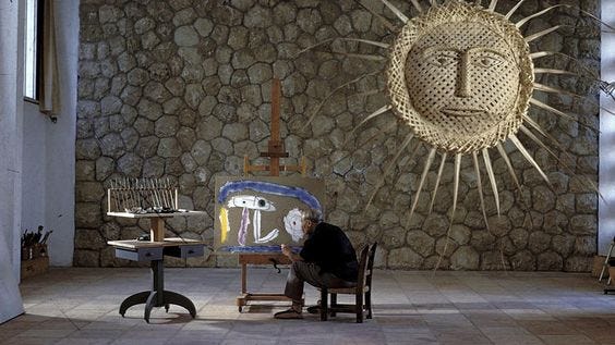 The woven sun on the mood board once hung in Joan Miró’s Mallorca studio, and the close-up doesn’t do it justice. Look how big it was!