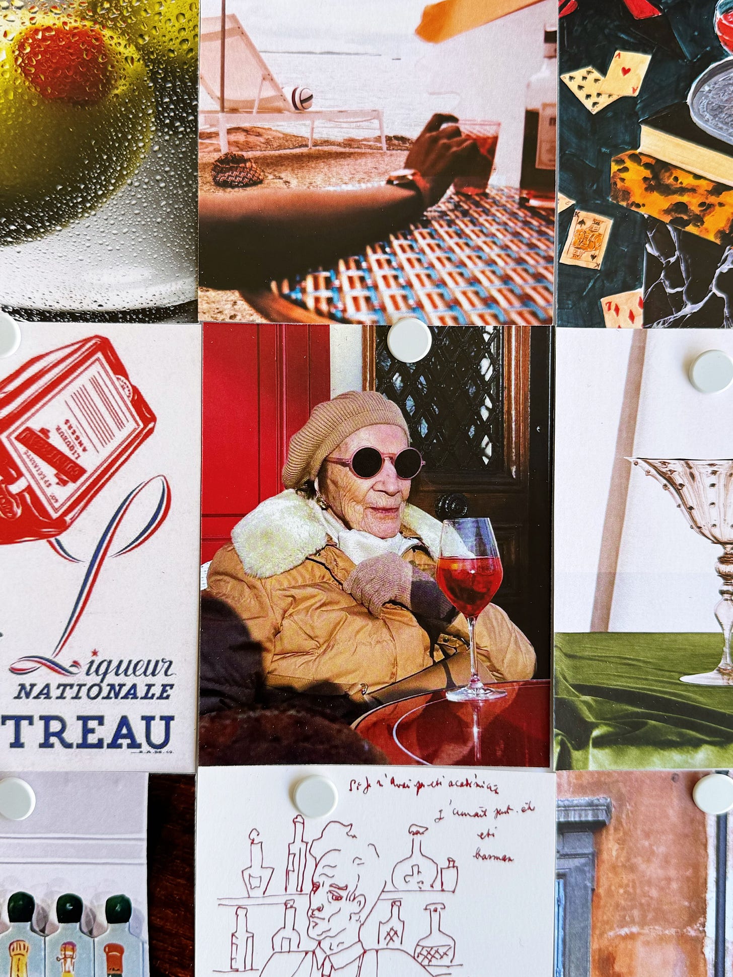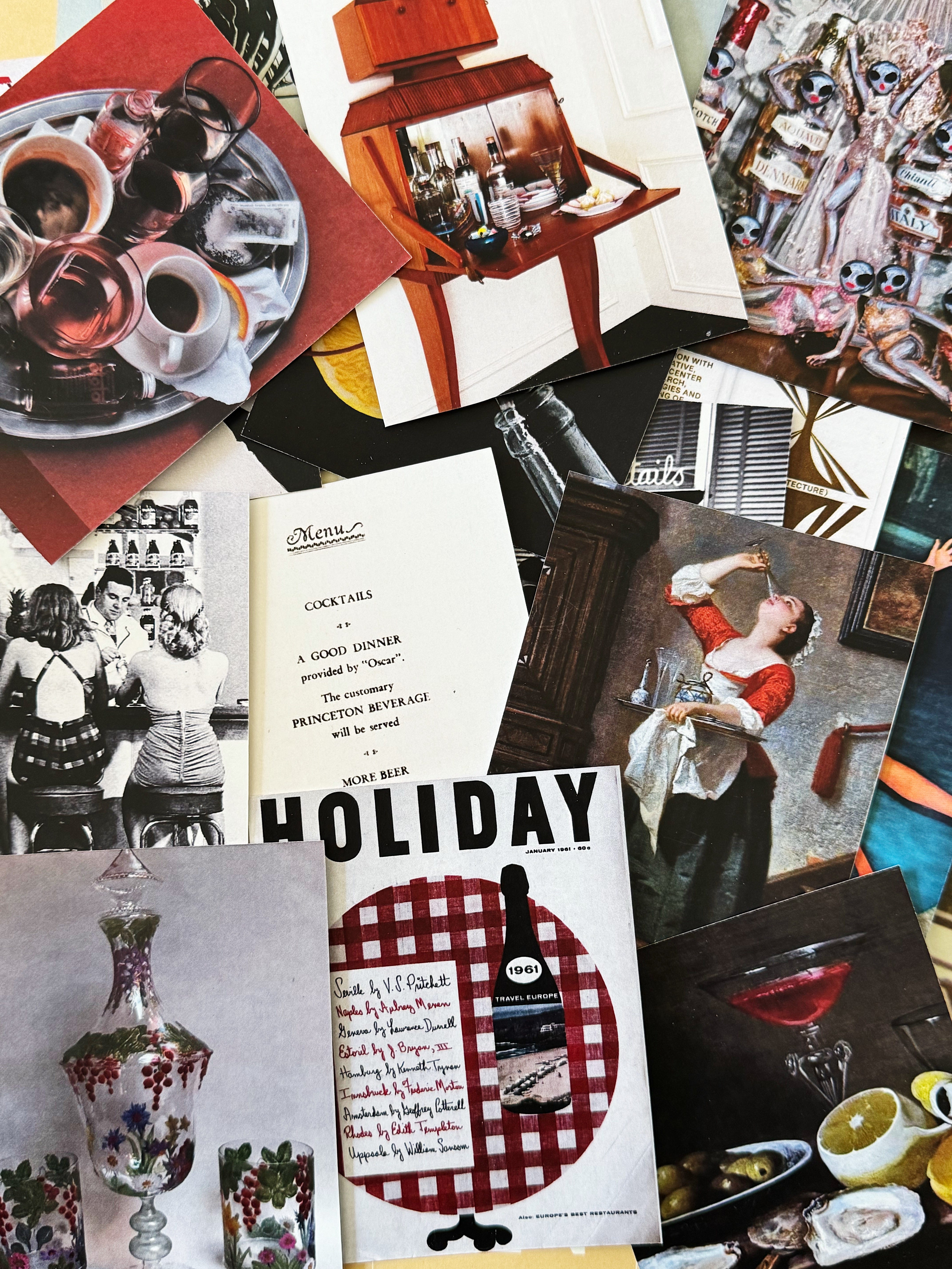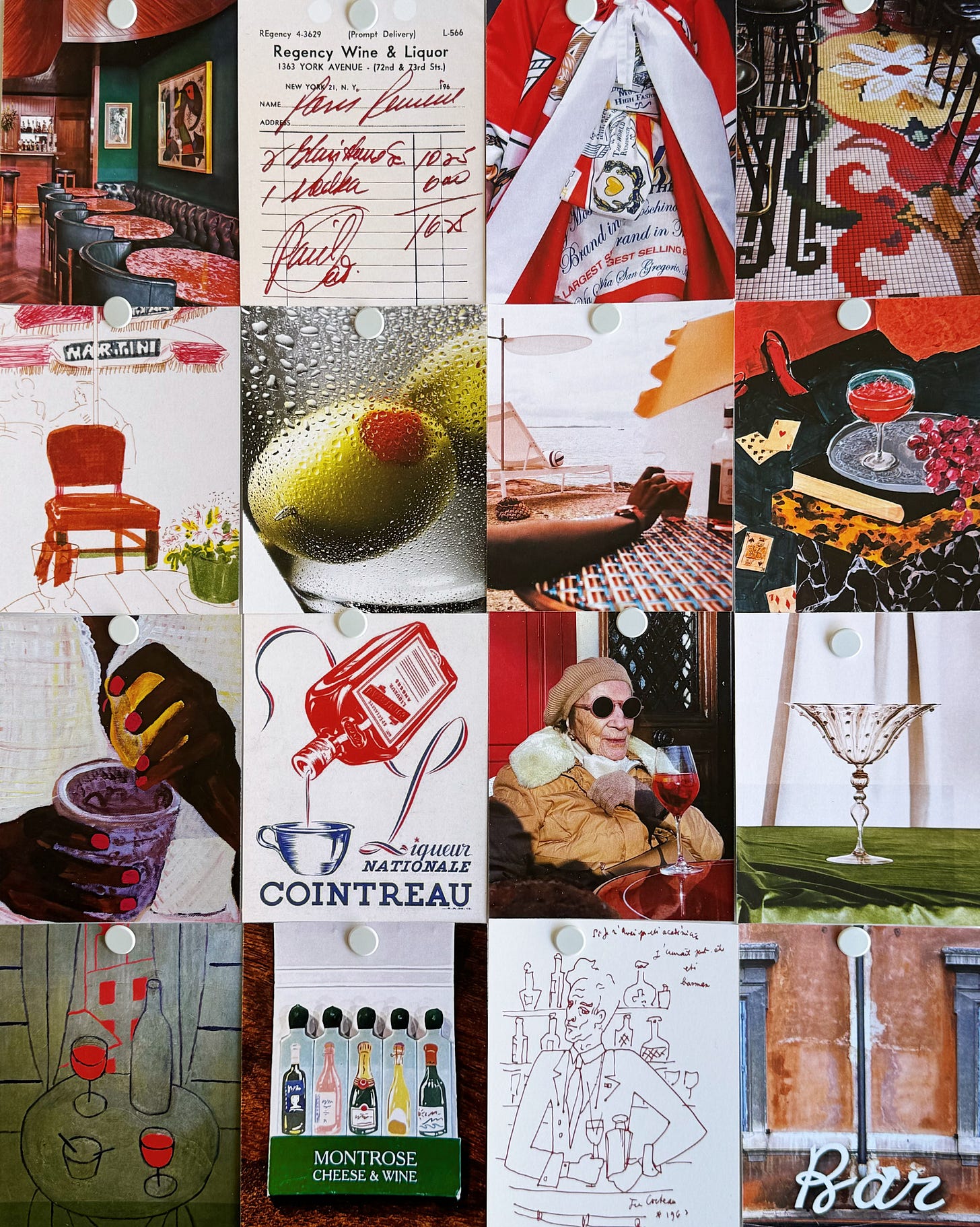 Sources: Kronenhalle Bar in Zurich, designed by Robert Haussmann, 1965; Paris Review, Andy Warhol, 1967; Moschino autumn/winter 2014; Floor of Tapas Bar Manero in Alicante, Spain; L'apéritif, David Hockney, date unknown; martini image by Lucy-Ruth Hathaway, 2020; image for Vogue Living by Levon Baird, 2020; Jeux de cartes, Yukiko Noritake, 2023; Easter Sunday, Danielle McKinney, 2020; Cointreau ad, Jean Adrien Mercier, 1940; woman with a spritz in France by Elie Obeid, via Gramparents; vintage Murano glass photographed by Victoria Zschommler, 2020; Terrace in Montmartre, John Zabawa, 2022; vintage matchbook from Montrose Cheese & Wine, Houston, TX; barman sketch, Jean Cocteau, 1962; bar in Rome, Louise Fili, 2017