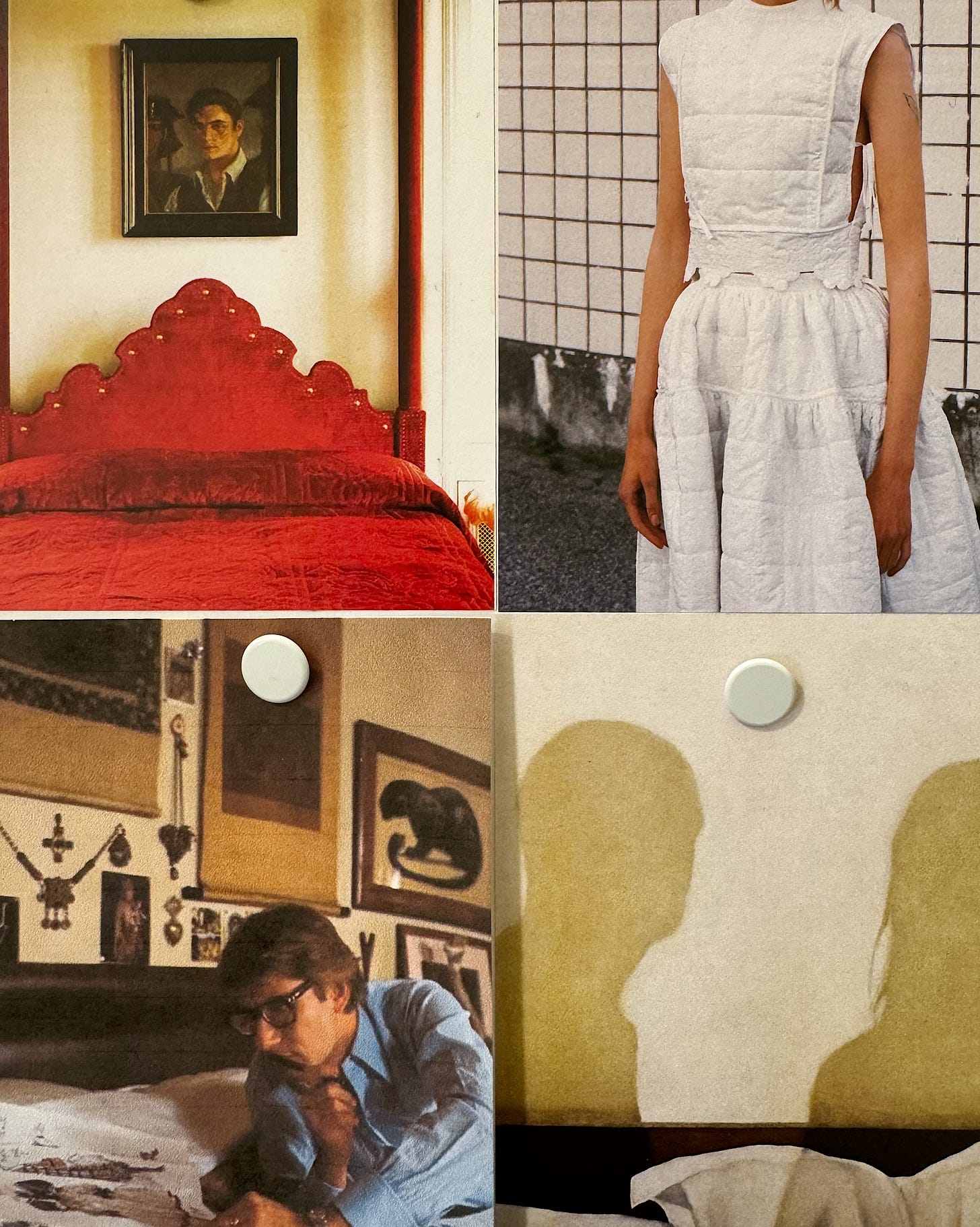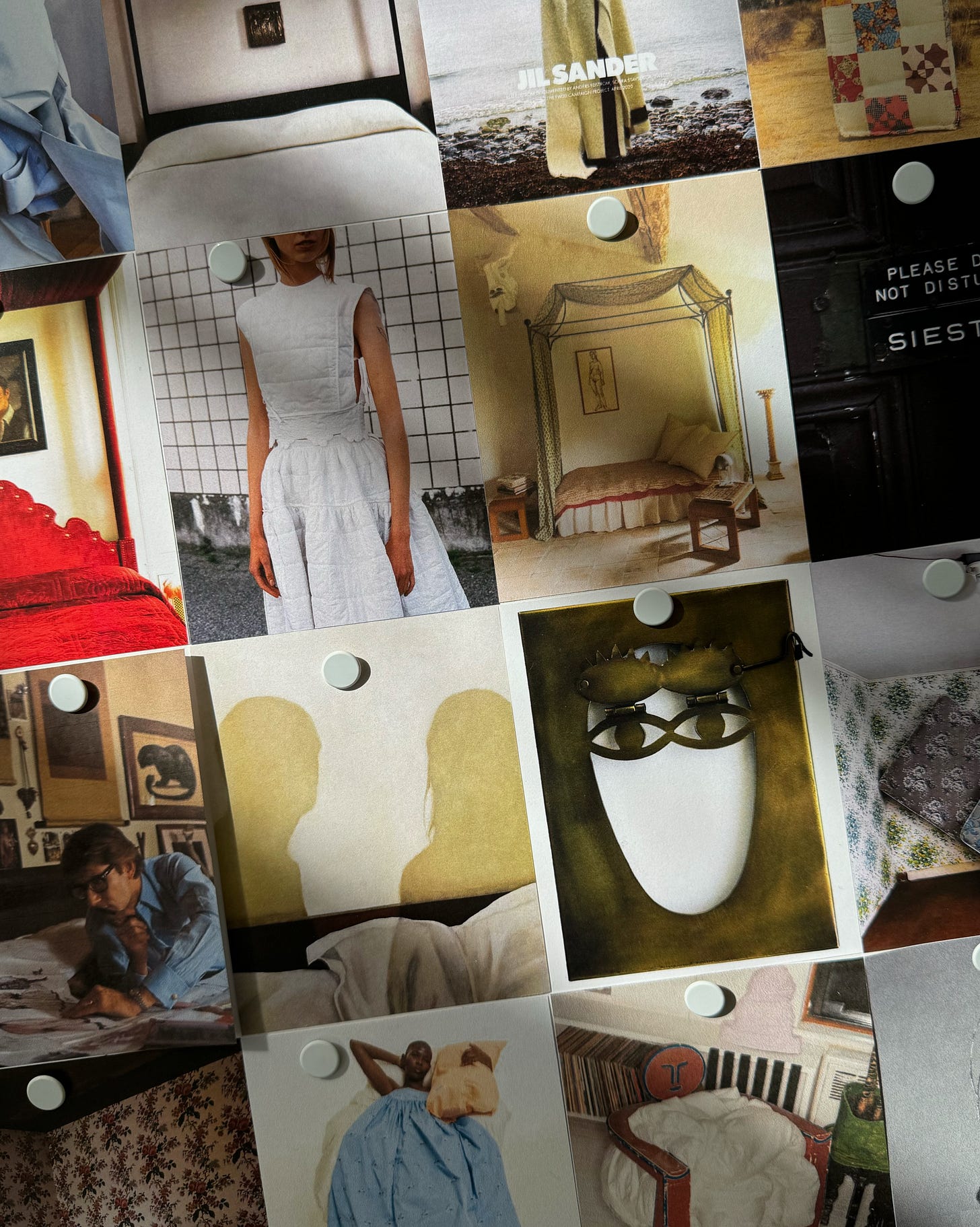 Sources: Detail at Carven SS25; bedroom at Hotel Peter and Paul in New Orleans, LA; Anders Edström for Jil Sander, 2020; quilt cushion from Bliss & Mischief; chateau by Les Trois Garcons, Matthew Salvaing for AD France; Josefine Seifert for Cecilie Bahnsen, 2019; bedroom in Provence by Atelier Vime; Yves Saint Laurent in Paris, 1978; Shall We Talk About It?, Jess Allen, 2023; metalwork face with flip-down eyelids at Ana Mandara Villas Dalat Resort & Spa in Dalat, Vietnam; mattress image by Andrew Emond, 2021; bedroom in Hudson, NY by General Assembly; Hedvig Jenning for Magniberg, 2021; Sabrina de Sousa for Buffy, 2018; Peggy Guggenheim with Silver Bedhead by Alexander Calder, 1945