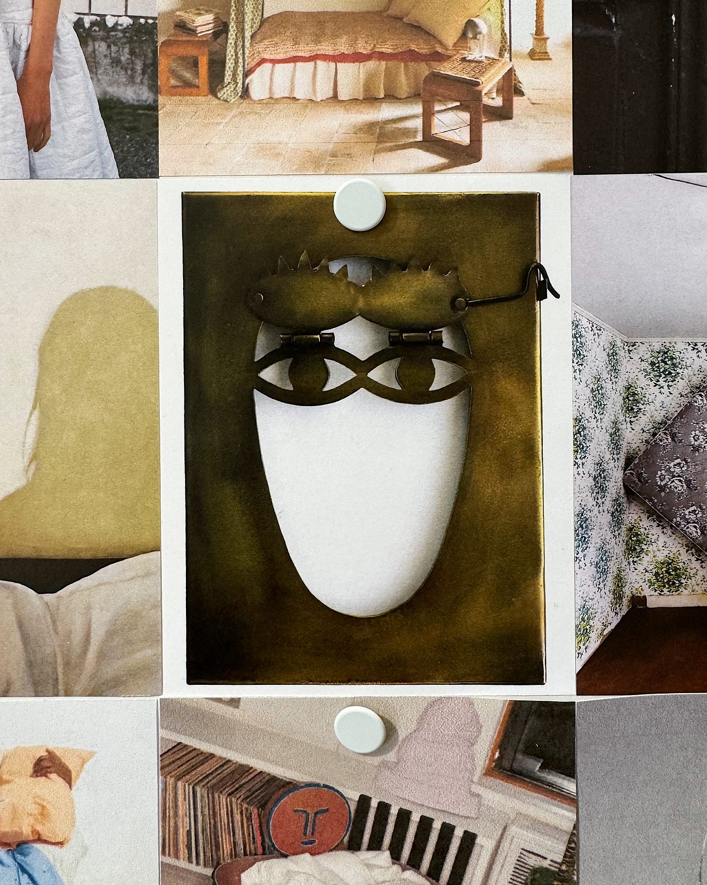Do you see the metal face thing on the mood board in the third row? It’s a do not disturb sign!!! I found it in this Collectors Weekly article called “The Art of Making People Go Away”. It’s from Ana Mandara Villas Dalat Resort & Spa in Dalat, Vietnam, so if anyone finds themselves there I’m going to need you to send me a video of yourself flipping the little eyelids closed.