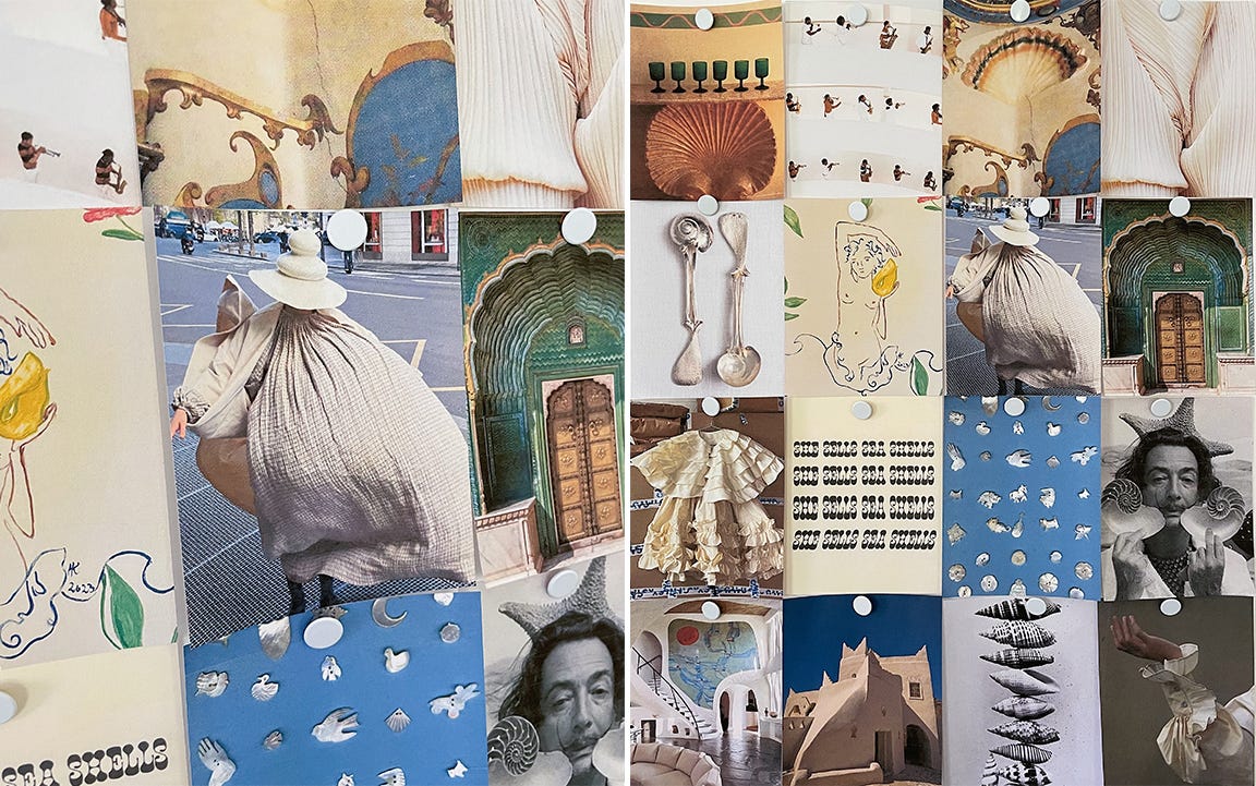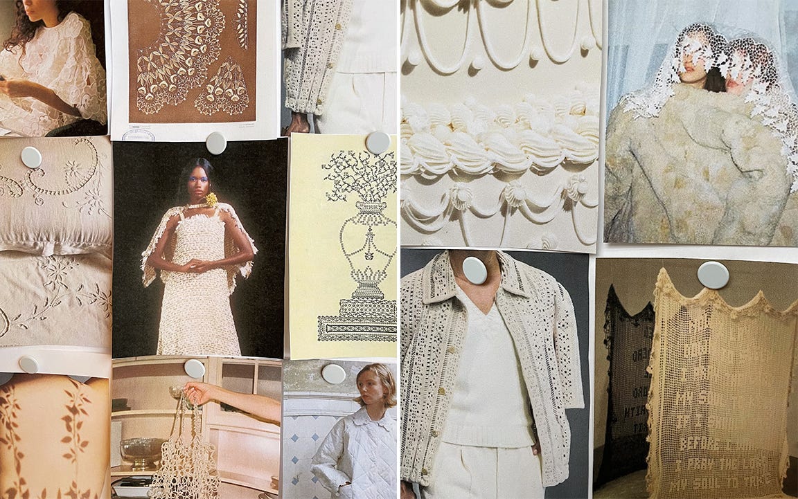 1. A theme based on a specific texture, pattern, shape, material, or visual device. When I make these boards I’m looking for images that are either an interesting use of the theme or that are somehow adjacent to it. For instance, when I did the lace mood board I used images of actual lace, but I also included a beaded bag that had a lace-like quality to it, shadows made by plants that felt sort of lacey, and a cake that just felt right in the mix. Other examples of themes like this that I’ve done are circles, plaids, monochrome, and metallics.