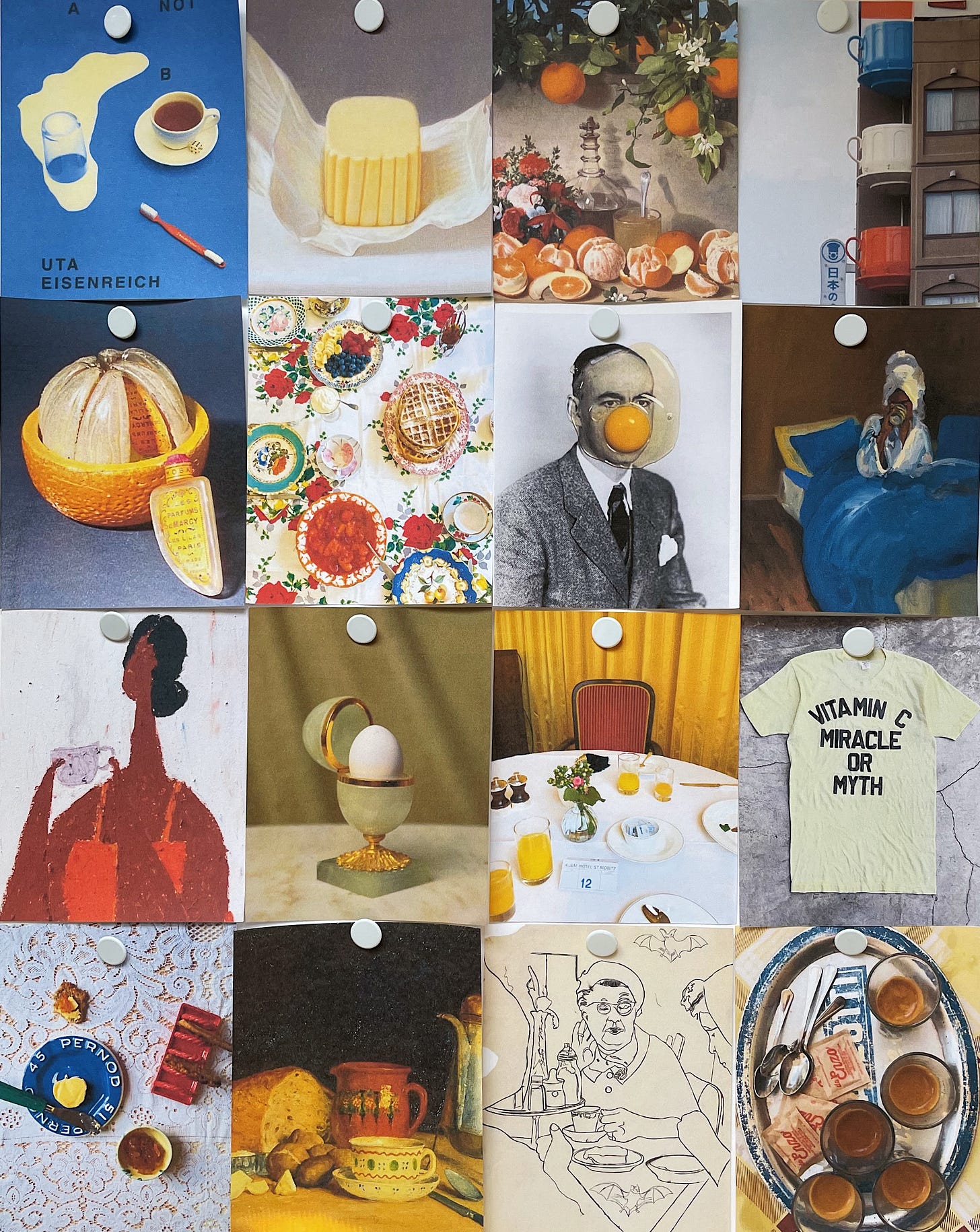 "A not B" by Uta Eisenreich; "Beurre Salé" by Arnout van Albada; "Still life with oranges" by Rafael Romero Barros, 1863; teacup balconies in Kappabashi, Tokyo; 1925 perfume bottle in the shape of an orange; tabletop image by Tatanaka; egg face by Brest Brest Brest; "Morning Glory" by Danielle Mckinney, 2023; "Sketch book, June 2019" by Niki Dionne; fancy egg cup from Casa Shop; breakfast table at Kulm Hotel St. Moritz by Luke Edward Hall; t-shirt from Unsound Rags; tabletop image by Matilda Goad; "Still life with coffee pot, milk jug, cup, bread, and potatoes" by Albert Anker, 1902; early sketch by Andy Warhol; and an image of espresso cups on a tray that I unfortunately can't find the source of for the life of me.