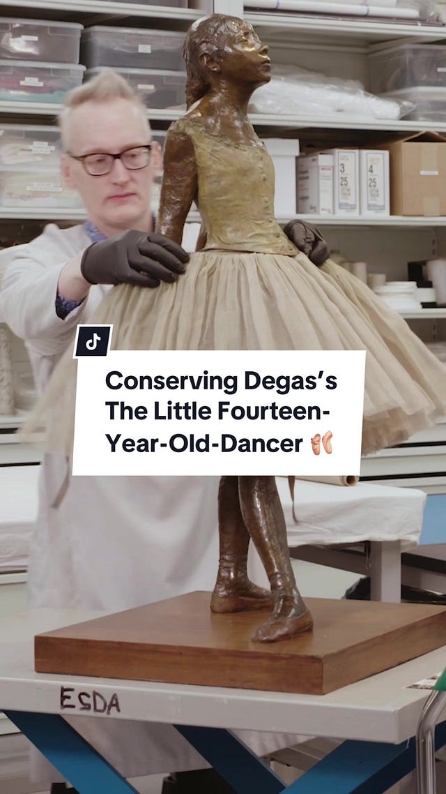 The Met recently replaced the tutu on Degas’ “The Little Fourteen-Year-Old Dancer”, a bronze statue c. 1880 of a young ballerina at the Paris Opera Ballet dance school. They shared the process in a TikTok; Glenn Peterson, Conservator at the Costume Institute, takes us through the thinking and reasoning behind the changes they made to the tutu’s structure and material and it’s so beautiful and interesting.
